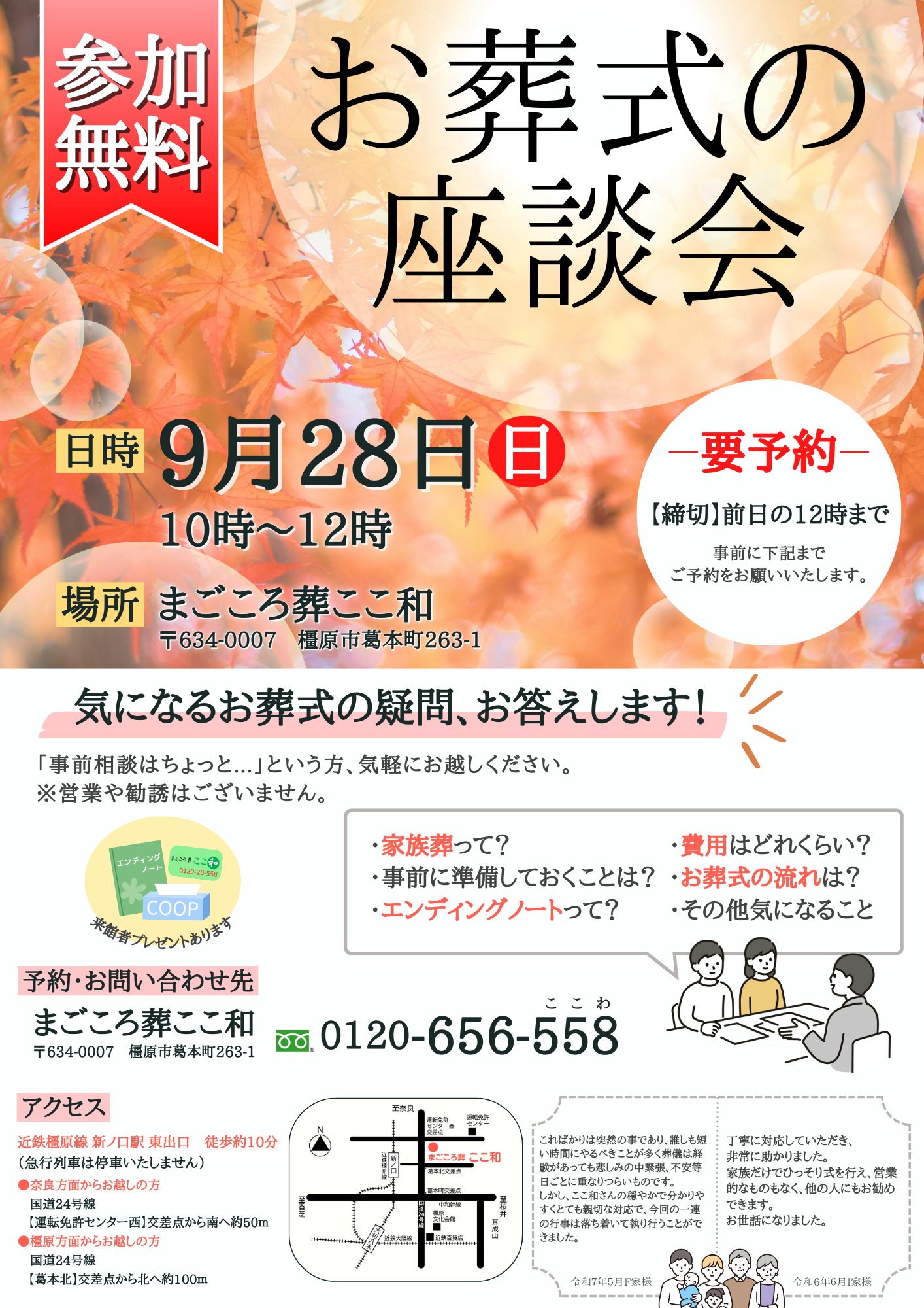 9月開催‼「お葬式の座談会」のお知らせ - まごころ葬ここ和